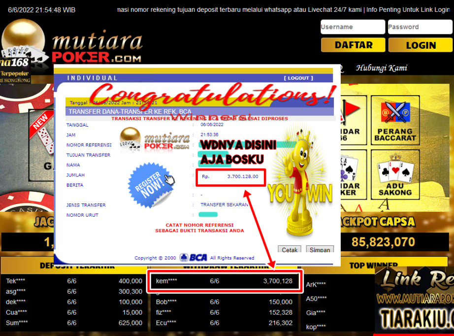 Selamat kepada member setia Mutiarapoker untuk kemenangannya