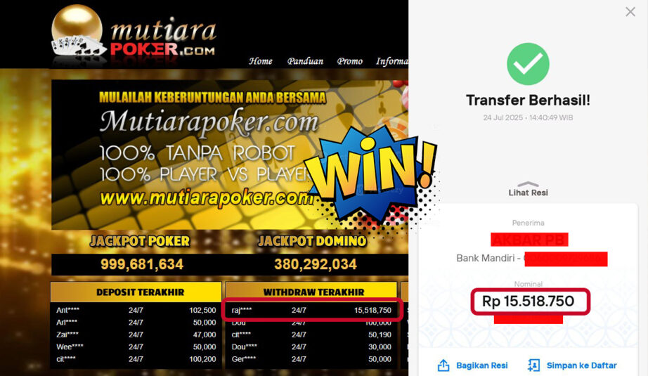 Bukti Withdraw ( 15,518,750,- ) Member Setia MutiaraPoker