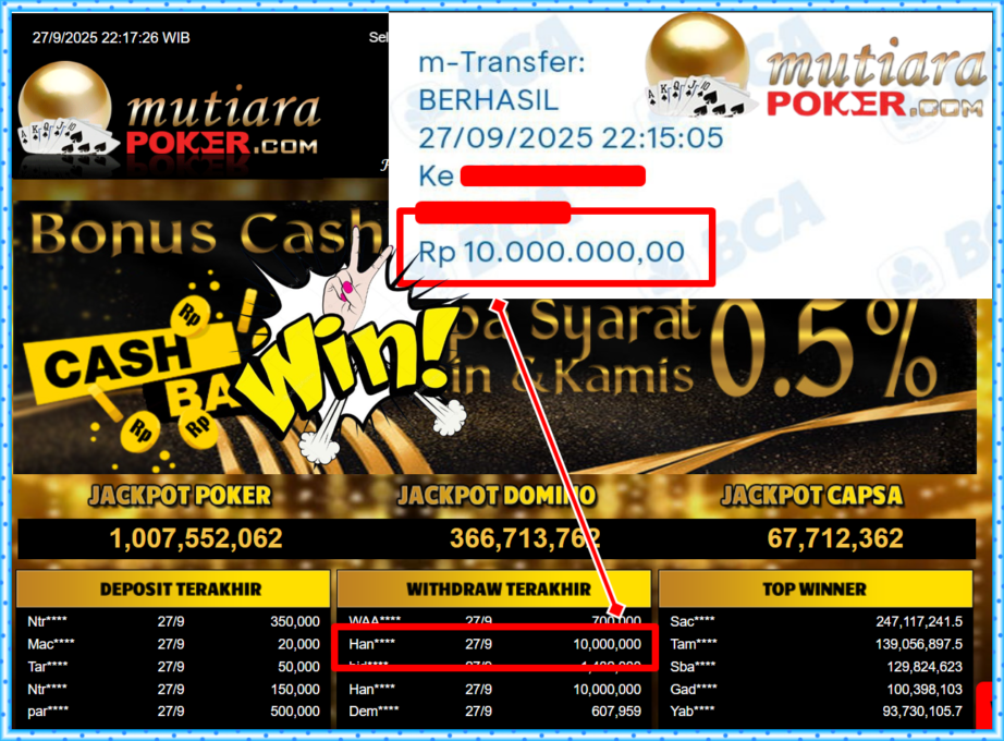 Bukti Withdraw ( 10,000,000,- ) Member Setia MutiaraPoker