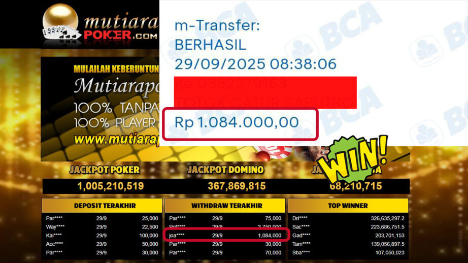 Bukti Withdraw ( 1,084,000,- ) Member Setia MutiaraPoker