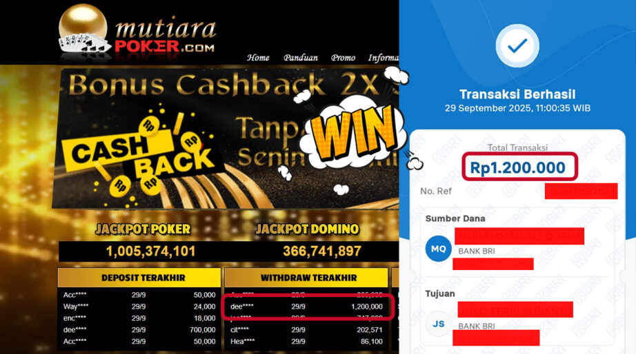 Bukti Withdraw ( 1,200,000,- ) Member Setia MutiaraPoker