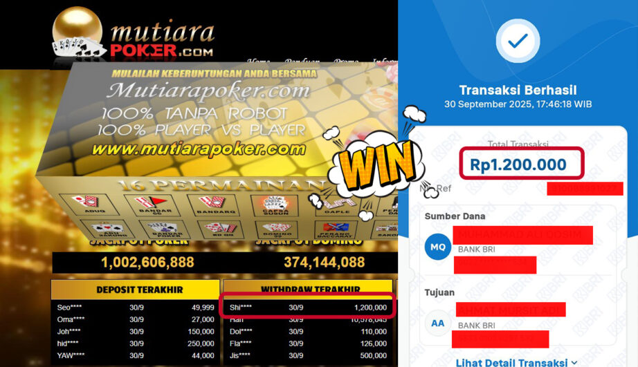 Bukti Withdraw ( 1,200,000,- ) Member Setia MutiaraPoker