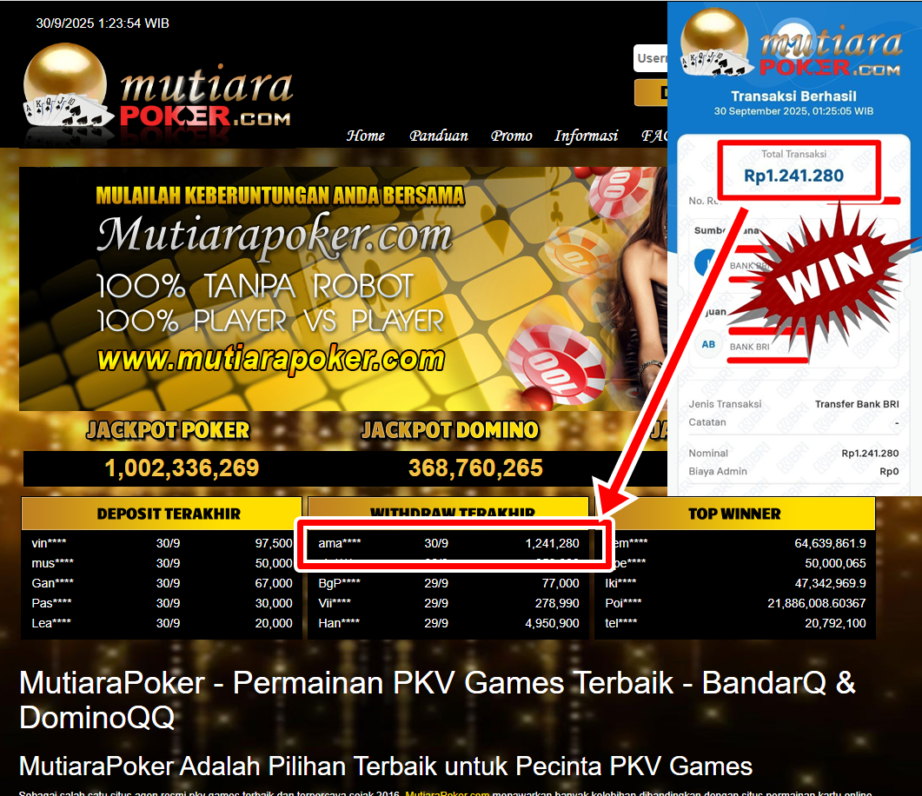 Bukti Withdraw ( 1,241,280,- ) Member Setia MutiaraPoker