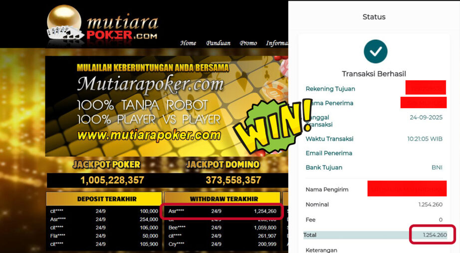 Bukti Withdraw ( 1,254,260,- ) Member Setia MutiaraPoker