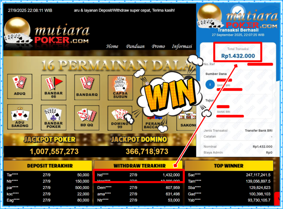 Bukti Withdraw ( 1,432,000,- ) Member Setia MutiaraPoker