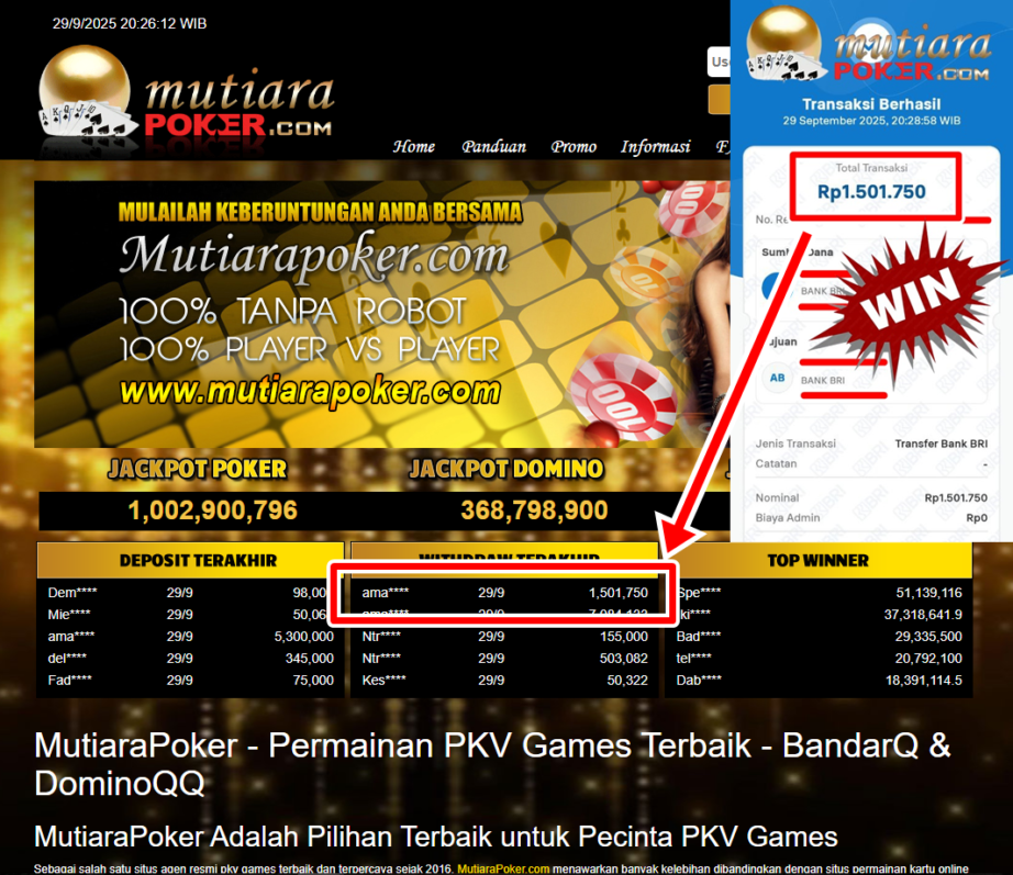 Bukti Withdraw ( 1,501,750,- ) Member Setia MutiaraPoker