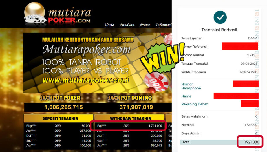 Bukti Withdraw ( 1,721,000,- ) Member Setia MutiaraPoker