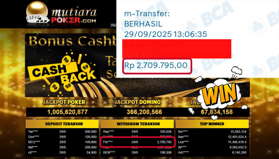 Bukti Withdraw ( 2,709,795,- ) Member Setia MutiaraPoker