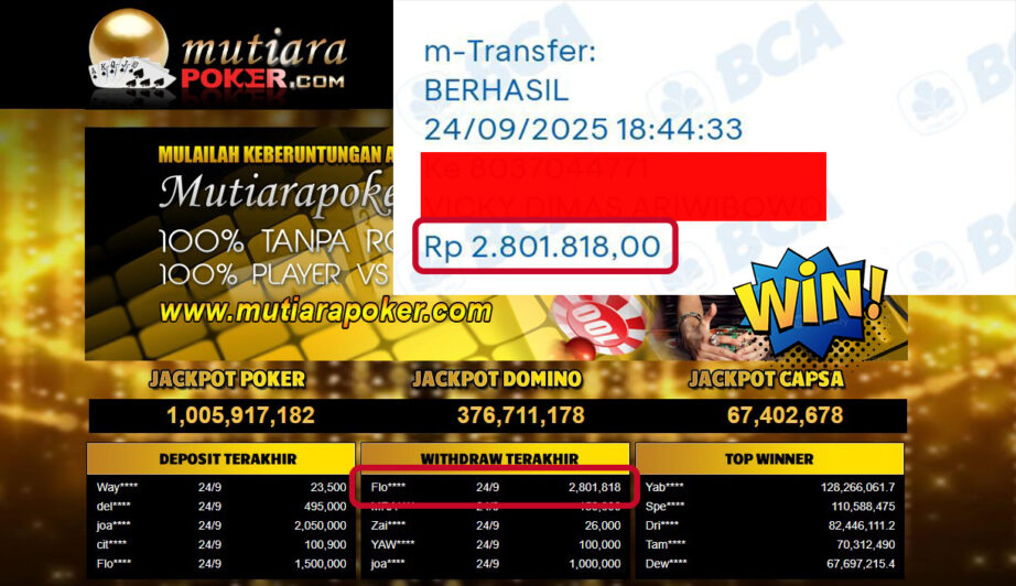 Bukti Withdraw ( 2,801,818,- ) Member Setia MutiaraPoker