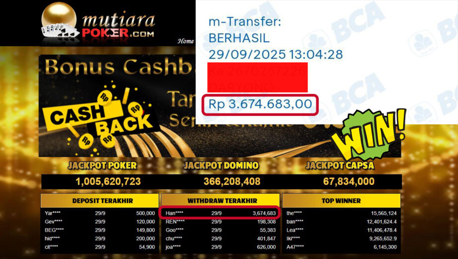 Bukti Withdraw ( 3,674,683,- ) Member Setia MutiaraPoker