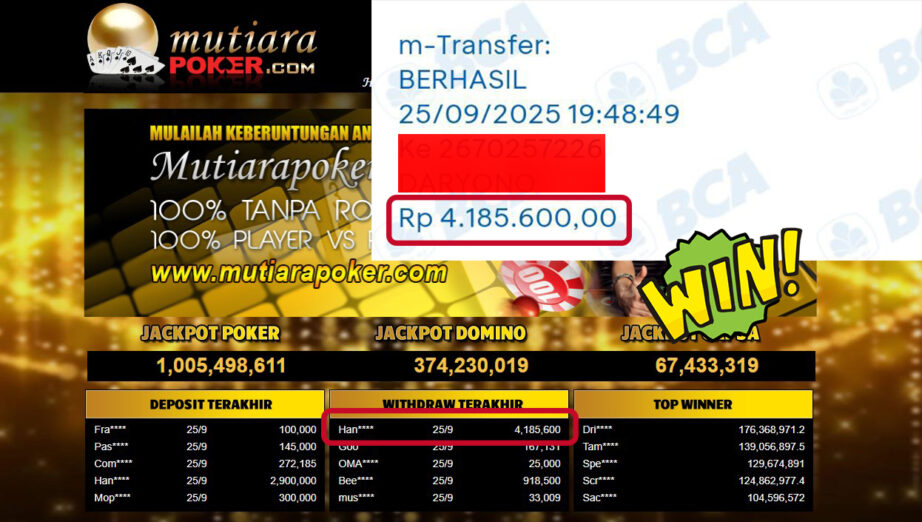 Bukti Withdraw ( 4,185,600,- ) Member Setia MutiaraPoker