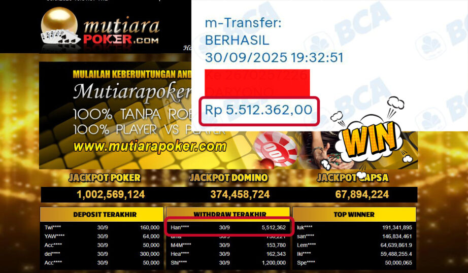 Bukti Withdraw ( 5,512,362,- ) Member Setia MutiaraPoker