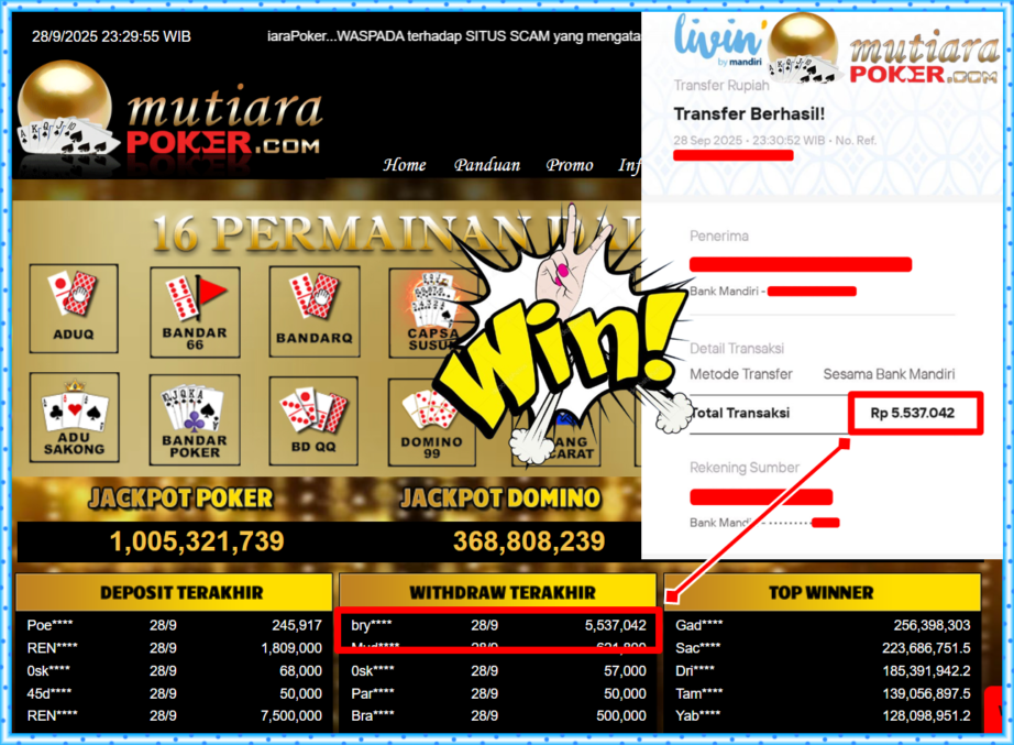 Bukti Withdraw ( 5,537,042,- ) Member Setia MutiaraPoker