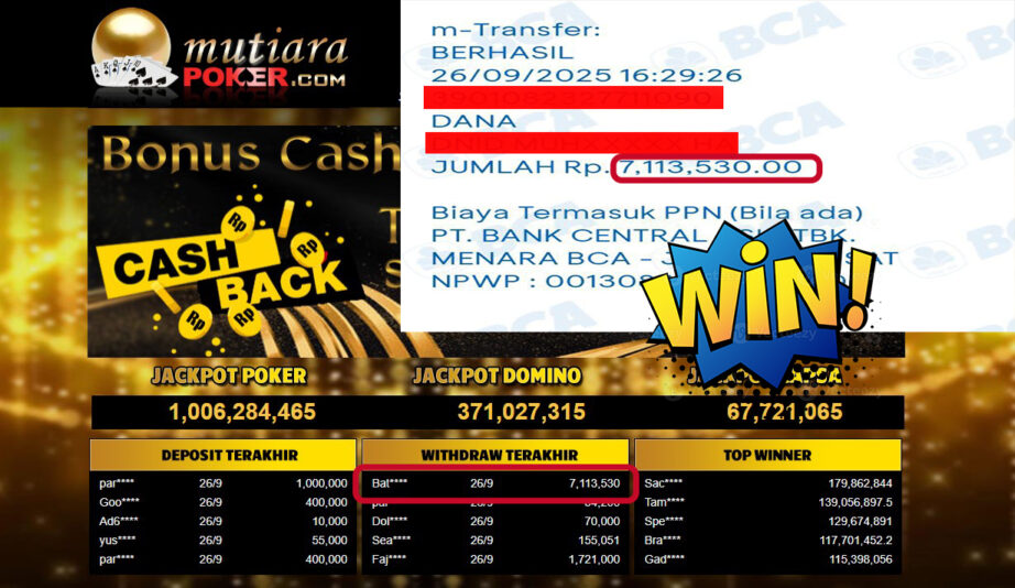Bukti Withdraw ( 7,113,530,- ) Member Setia MutiaraPoker