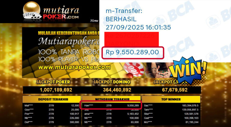 Bukti Withdraw ( 9,550,289,- ) Member Setia MutiaraPoker