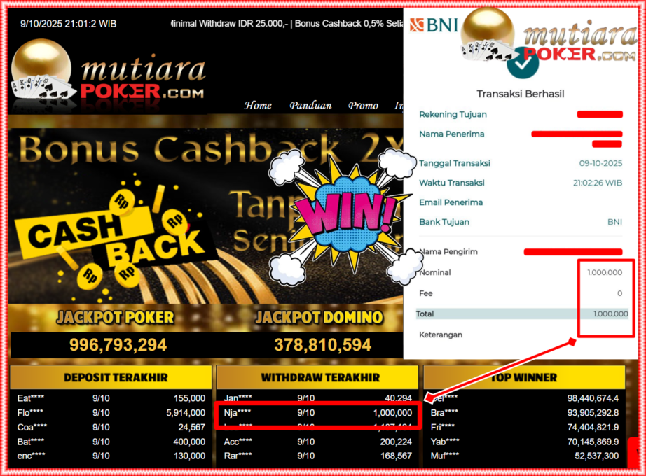 Bukti Withdraw ( 1,000,000,- ) Member Setia MutiaraPoker