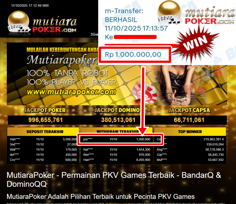 Bukti Withdraw ( 1,000,000,- ) Member Setia MutiaraPoker