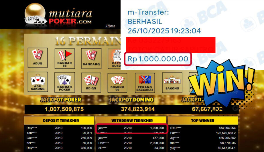 Bukti Withdraw ( 1,000,000,- ) Member Setia MutiaraPoker