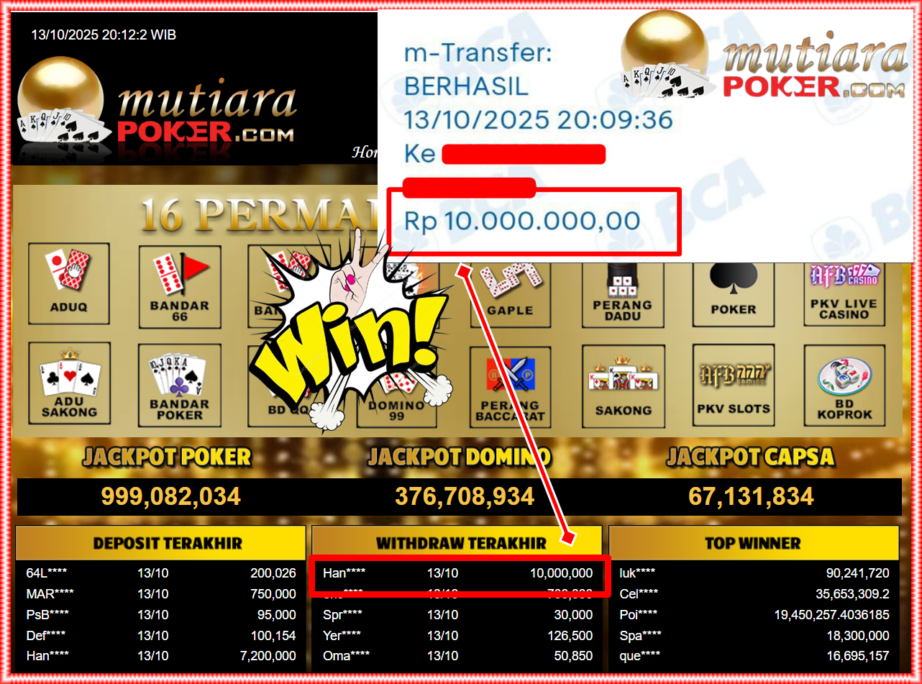 Bukti Withdraw ( 10,000,000,- ) Member Setia MutiaraPoker