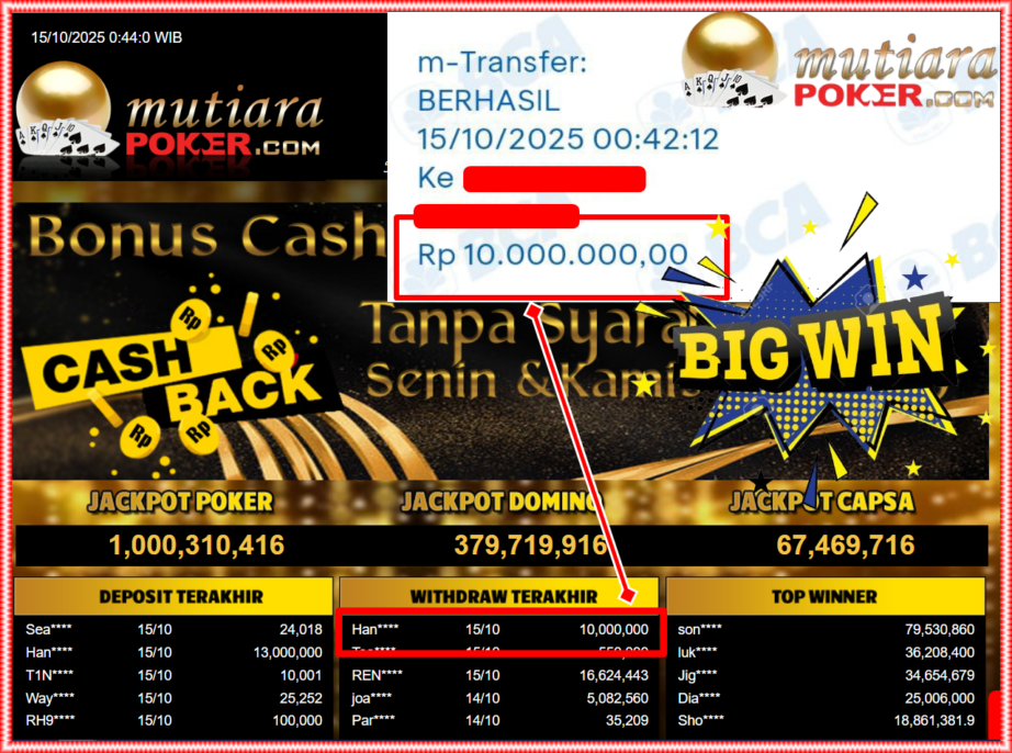 Bukti Withdraw ( 10,000,000,- ) Member Setia MutiaraPoker