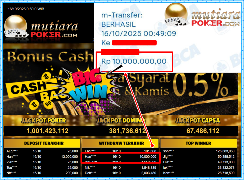 Bukti Withdraw ( 10,000,000,- ) Member Setia MutiaraPoker