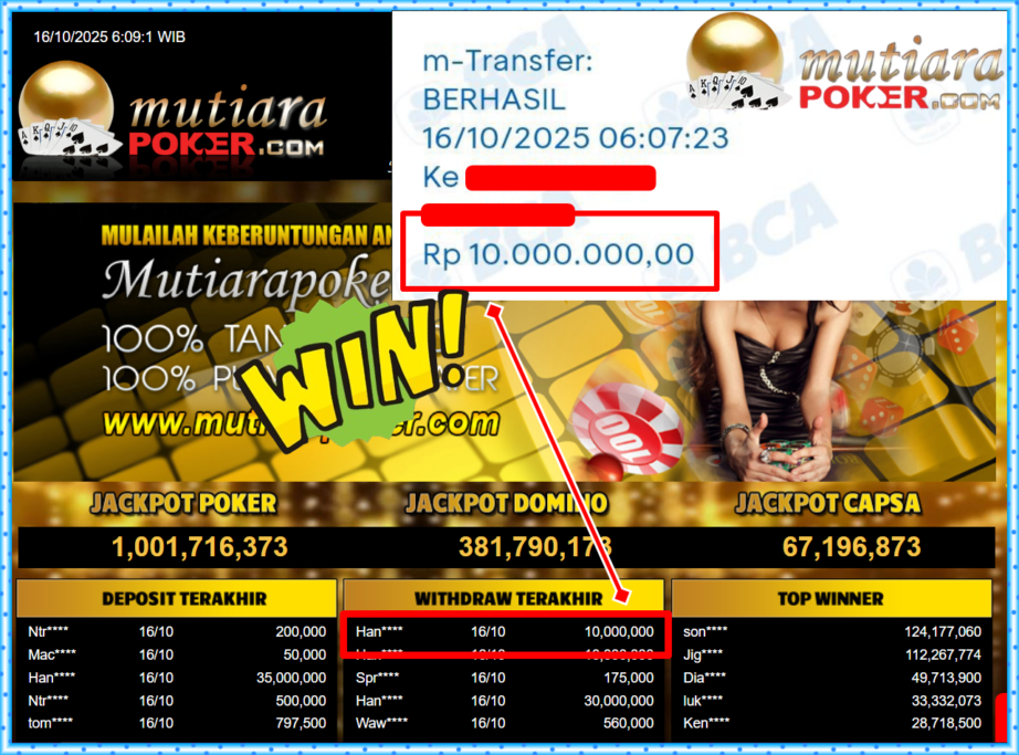 Bukti Withdraw ( 10,000,000,- ) Member Setia MutiaraPoker
