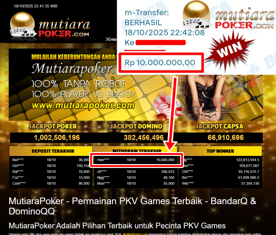 Bukti Withdraw ( 10,000,000,- ) Member Setia MutiaraPoker