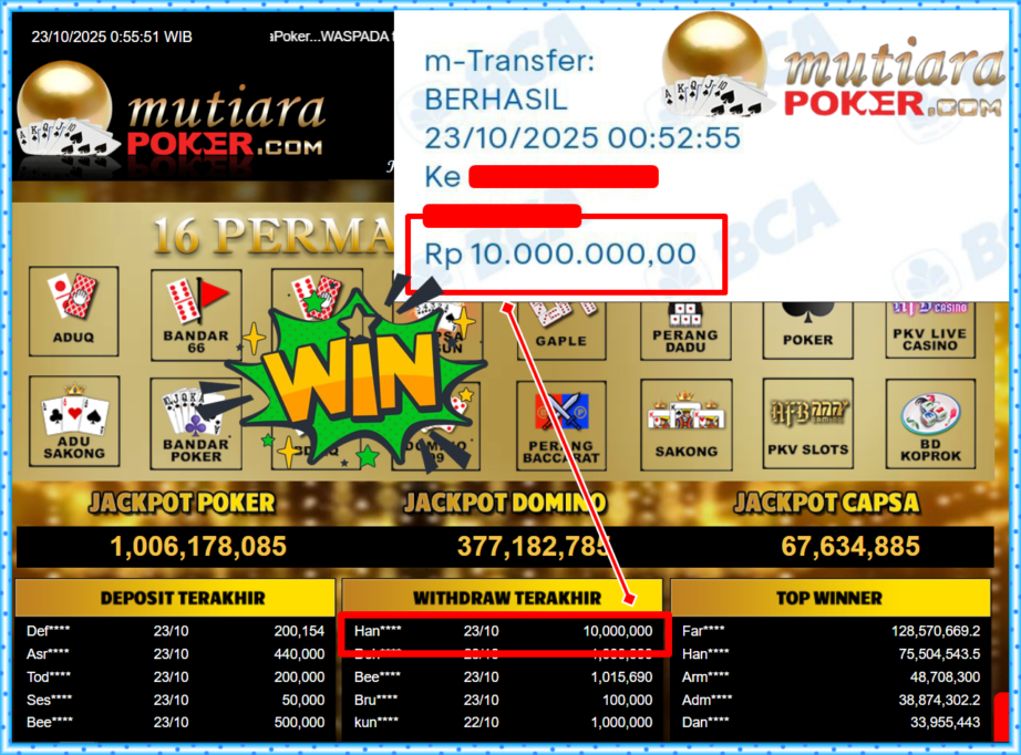 Bukti Withdraw ( 10,000,000,- ) Member Setia MutiaraPoker