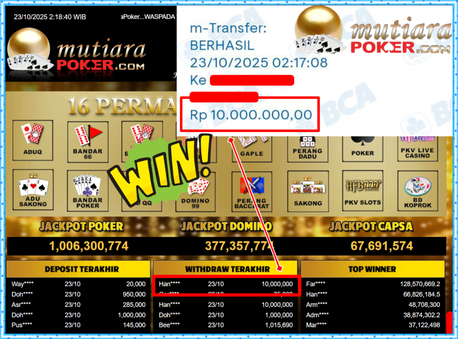 Bukti Withdraw ( 10,000,000,- ) Member Setia MutiaraPoker