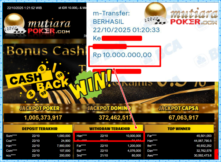 Bukti Withdraw ( 10,000,000,- ) Member Setia MutiaraPokerc
