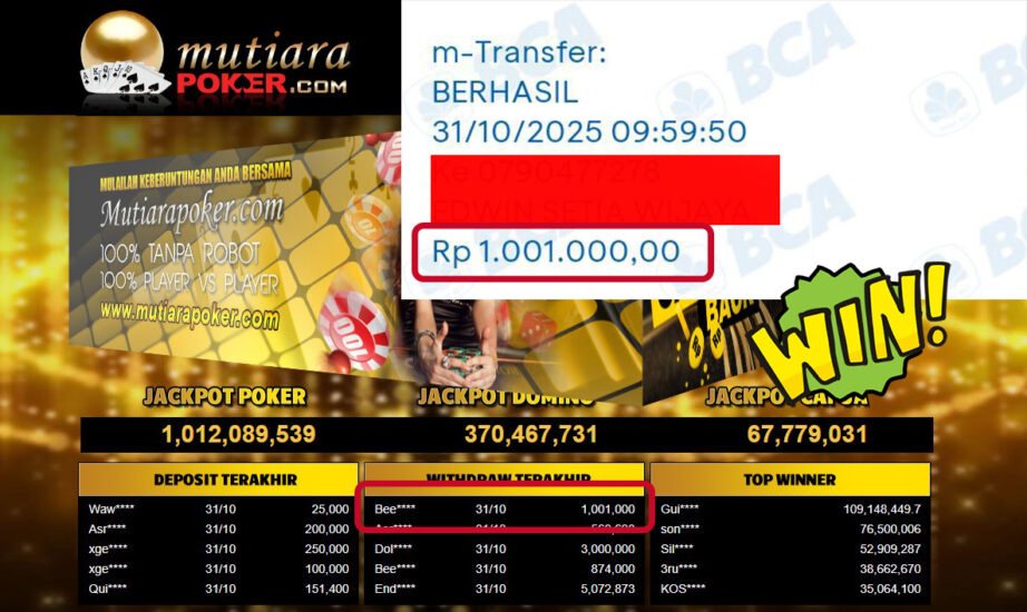 Bukti Withdraw ( 1,001,000,- ) Member Setia MutiaraPoker