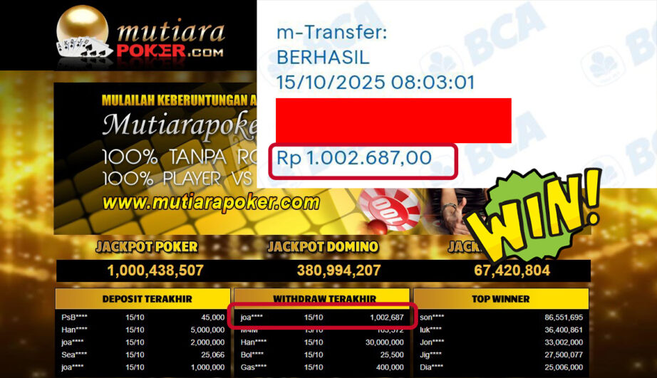 Bukti Withdraw ( 1,002,687,- ) Member Setia MutiaraPoker