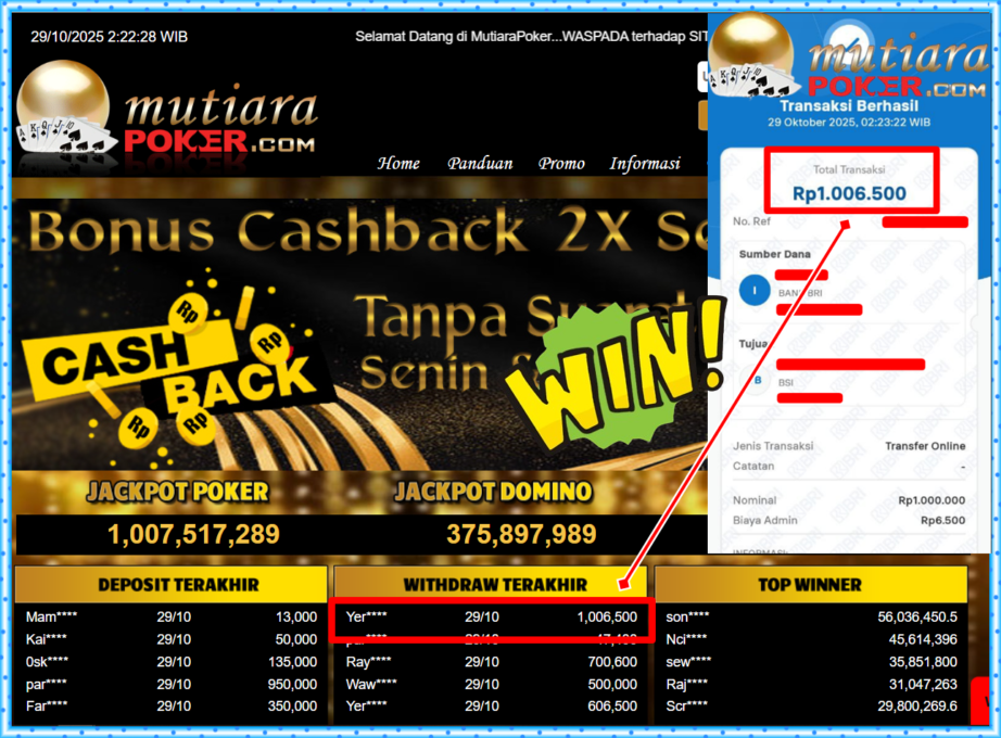 Bukti Withdraw ( 1,006,500,- ) Member Setia MutiaraPoker