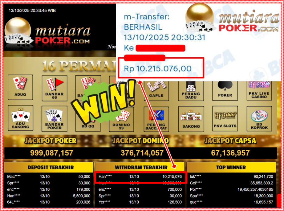 Bukti Withdraw ( 10,215,076,- ) Member Setia MutiaraPoker