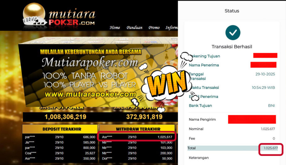 Bukti Withdraw ( 1,025,617,- ) Member Setia MutiaraPoker