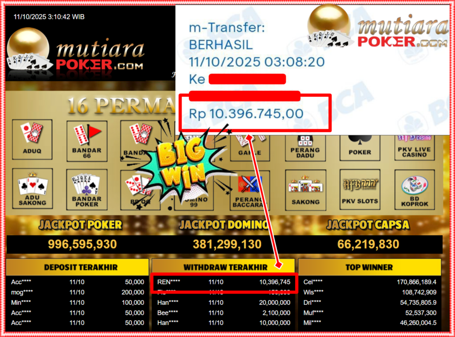 Bukti Withdraw ( 10,396,745,- ) Member Setia MutiaraPoker