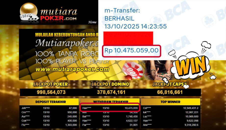 Bukti Withdraw ( 10,475,059,- ) Member Setia MutiaraPoker