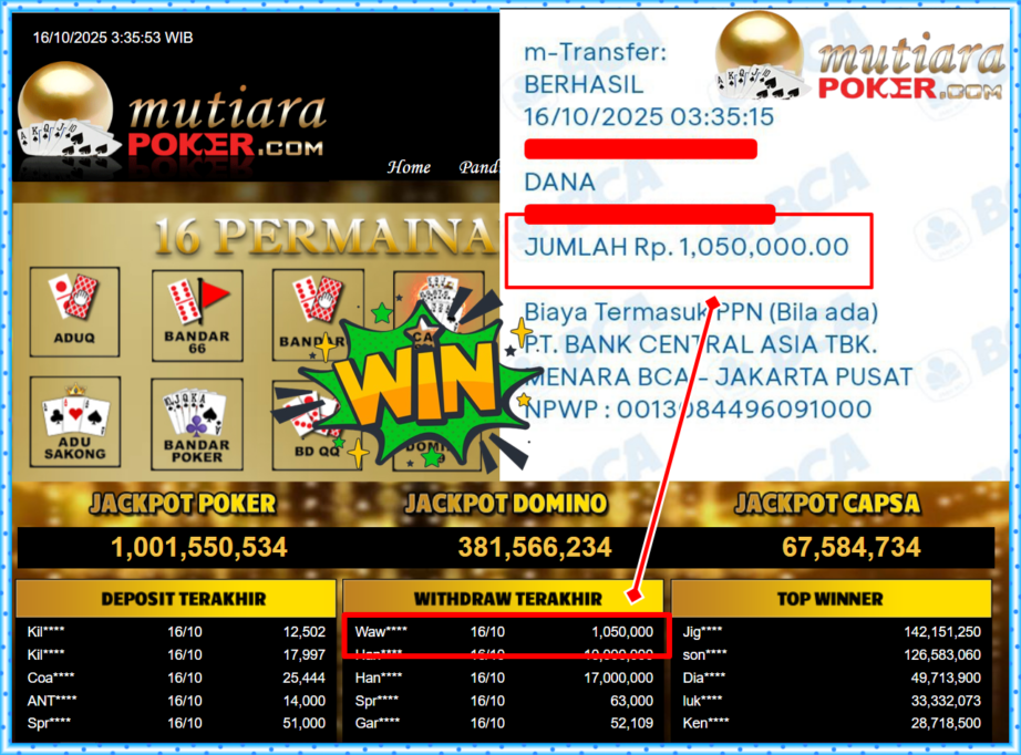 Bukti Withdraw ( 1,050,000,- ) Member Setia MutiaraPoker