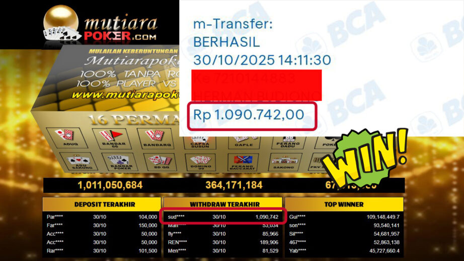 Bukti Withdraw ( 1,090,742,- ) Member Setia MutiaraPoker