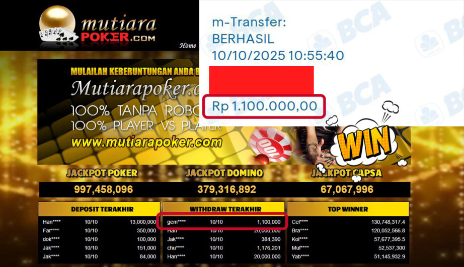 Bukti Withdraw (1,100,000,- ) Member Setia MutiaraPoker