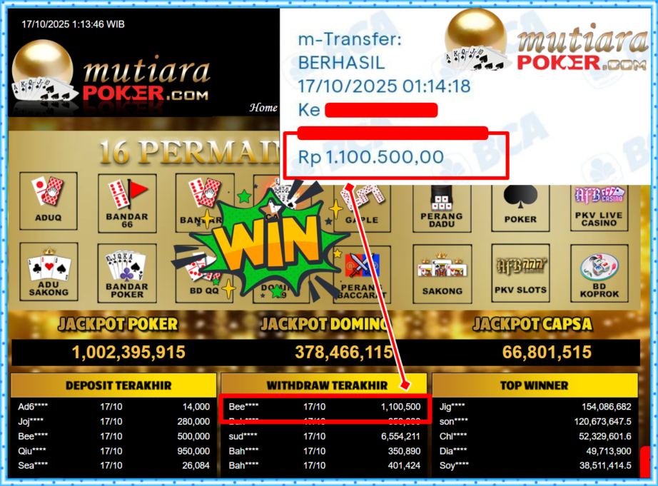 Bukti Withdraw ( 1,100,500,- ) Member Setia MutiaraPoker