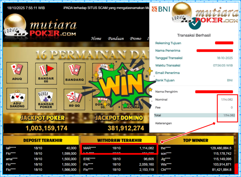 Bukti Withdraw ( 1,114,082,- ) Member Setia MutiaraPoker