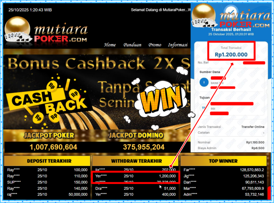 Bukti Withdraw ( 1,200,000,- ) Member Setia MutiaraPoker