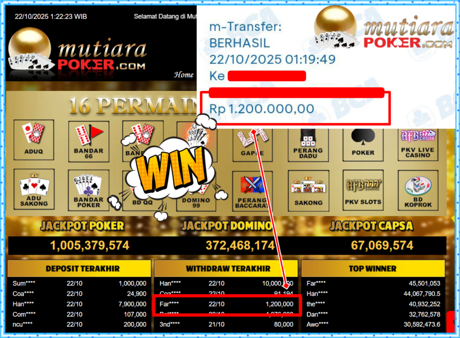 Bukti Withdraw ( 1,200,000,- ) Member Setia MutiaraPokerc