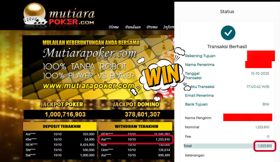 Bukti Withdraw ( 1,253,810,- ) Member Setia MutiaraPoker