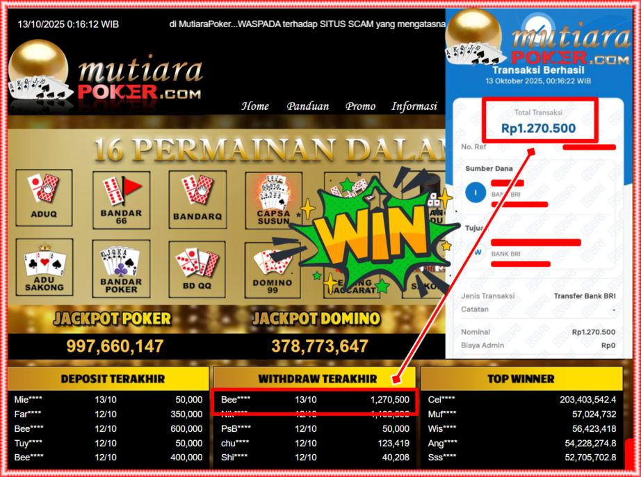 Bukti Withdraw ( 1,270,500,- ) Member Setia MutiaraPoker