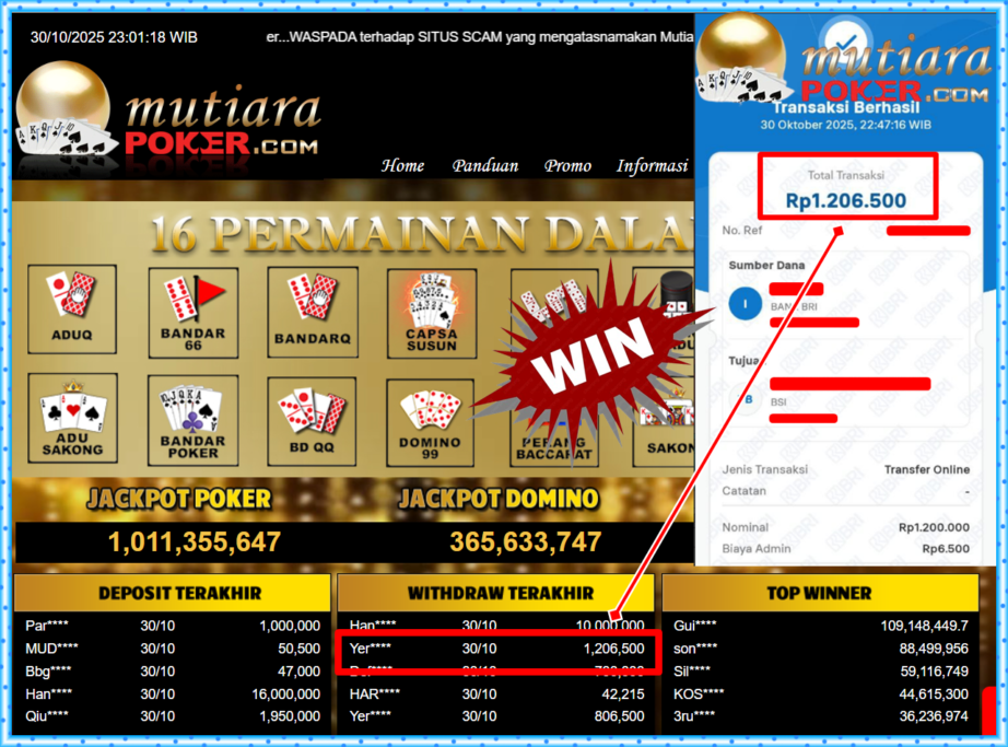 Bukti Withdraw ( 13,105,461,- ) Member Setia MutiaraPoker