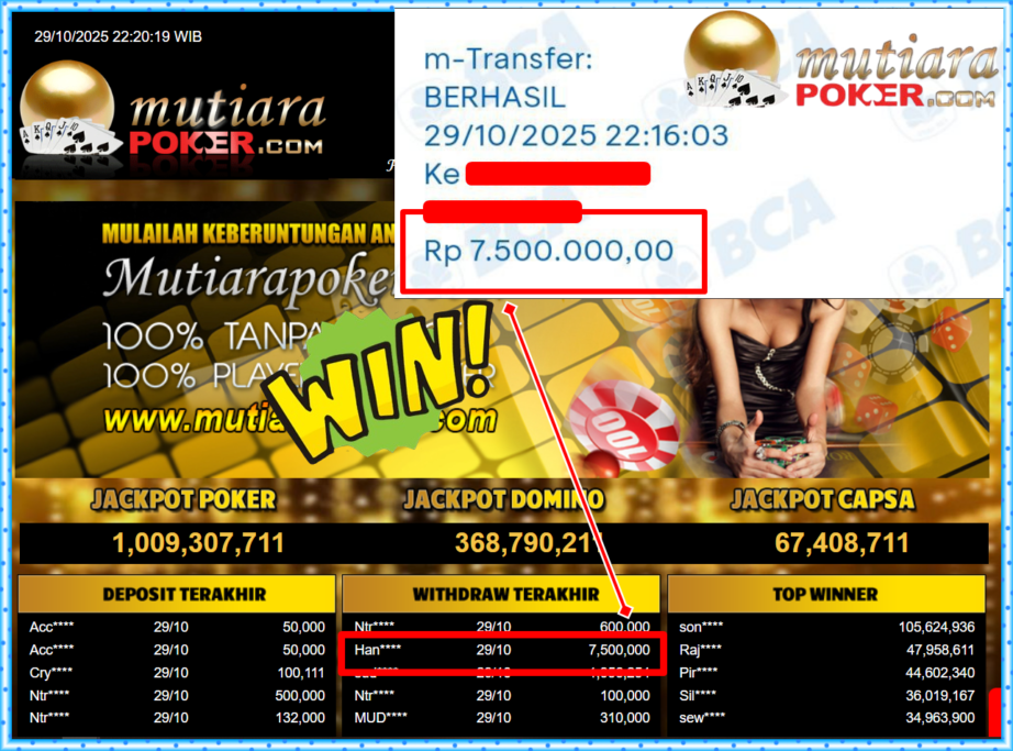 Bukti Withdraw ( 7,500,000,- ) Member Setia MutiaraPoker