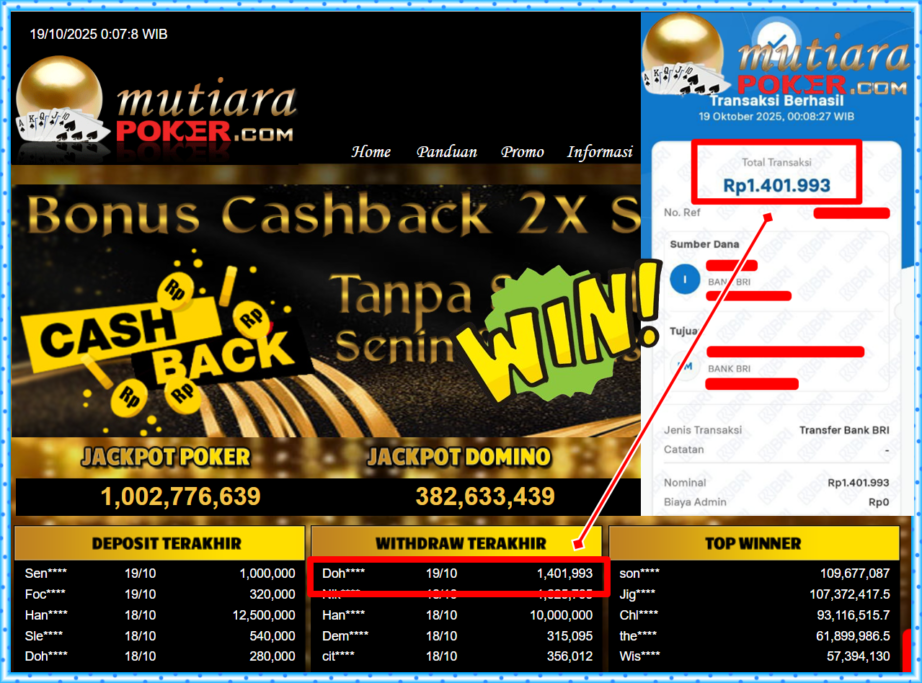 Bukti Withdraw ( 1,401,993,- ) Member Setia MutiaraPoker