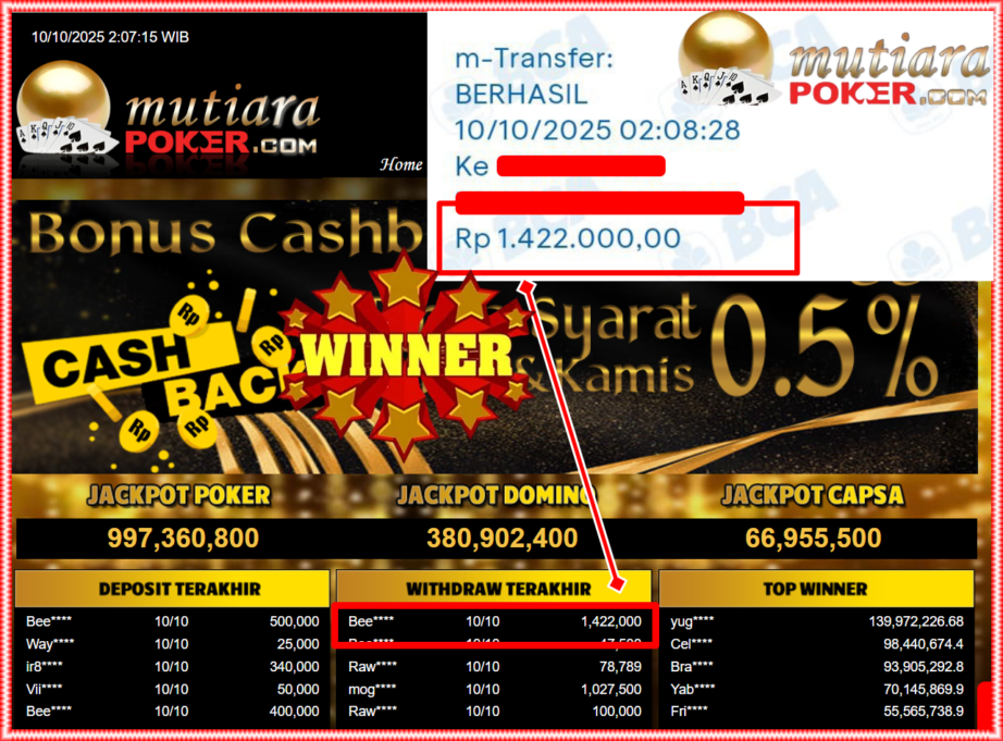 Bukti Withdraw ( 1,422,000,- ) Member Setia MutiaraPoker